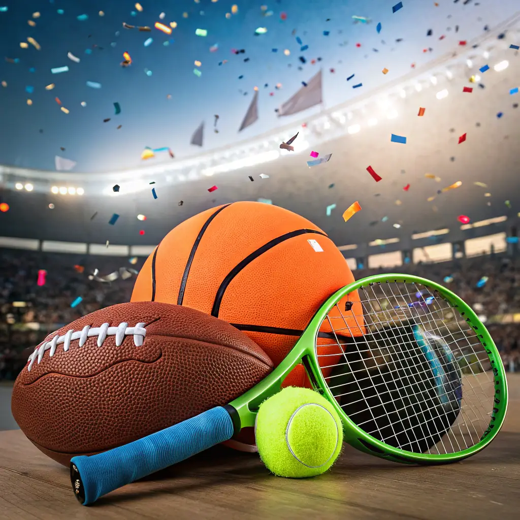 An image featuring a diverse selection of sports equipment (basketball, baseball, football) arranged to symbolize the wide variety of sports available for betting on GameX Sports.